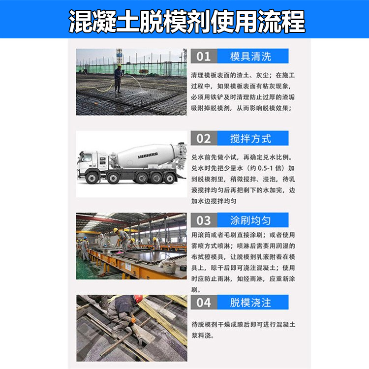 针对市场上混凝土制品及施工行业模板存放易生锈、混凝土表面有气泡、混凝土表面易污染、脱模清模困难等难题,推荐使用高效混凝土脱模剂,它由水性高分子成膜物质为主剂配以多种活性助剂经科学的加工工艺制成。产品稳定,性能优越,是创优质工程必备的高性能的混凝土脱模材料。混凝土脱模剂用于混凝土浇注前涂抹在施工用模板上,以使浇注后模板不致粘在混凝土表面上不易拆模,或影响混凝土表面的光洁度。其主要作用为在模板与混凝土表面形成一层膜将两者隔离开故又称隔离剂。